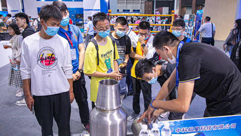 在中挪未來(lái)創(chuàng)新科技(青島)有限公司展區(qū),參觀者們正在通過(guò)視頻了解船體除銹機(jī)器人的工作過(guò)程。“它能自動(dòng)吸附在船體上,把生銹的大船清理的干干凈凈?!币晃恍∨笥迅嬖V記者。