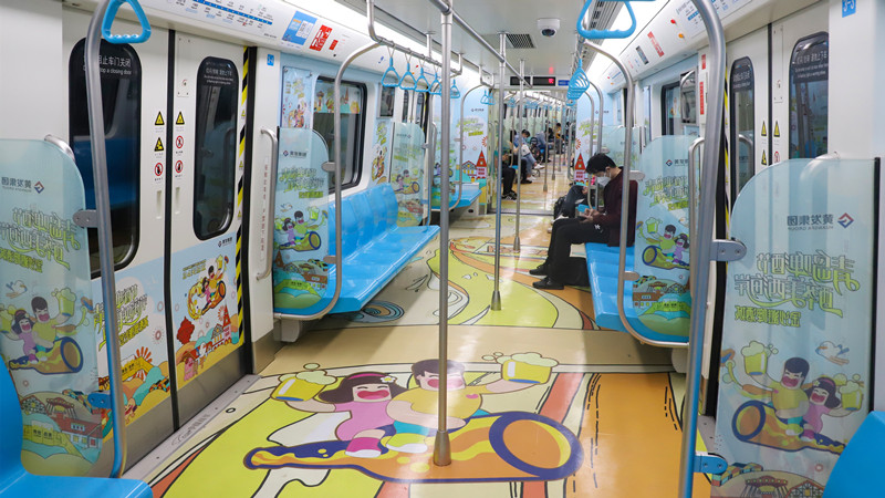 “地鐵專列利用車廂的立體空間,以插畫手繪風(fēng)為主要設(shè)計風(fēng)格,將金沙灘啤酒城IP形象——‘哈舅’作為靈魂人物,帶領(lǐng)乘客穿梭于六大主題車廂間,共同感受新區(qū)魅力,打造了場景化的品牌營銷,帶給乘客沉浸式體驗?!秉S發(fā)集團策劃部工作人員趙益弘介紹。