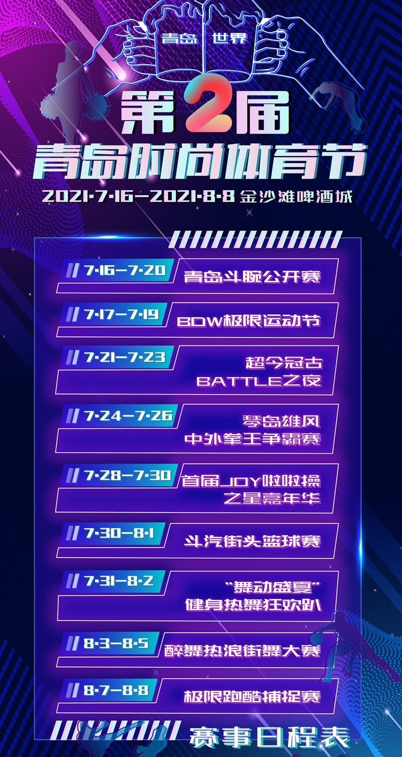 7月16日-8月8日,第31屆青島國際啤酒節(jié)將在青島西海岸新區(qū)金沙灘啤酒城舉行。屆時,第二屆“時尚體育節(jié)”將在金沙灘啤酒城舉辦,包含斗腕、極限運(yùn)動、拳王爭霸賽、搏克、街頭籃球、街舞、跑酷等9大類賽事30余項體育活動。與去年相比,本屆體育節(jié)賽事規(guī)格升級、活動多樣、參賽范圍更廣,體育競賽表演更豐富,將為市民游客奉上一場集競技性、觀賞性、參與性于一體的體育盛會。